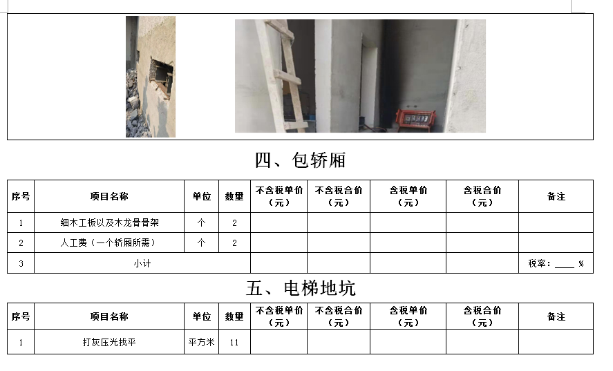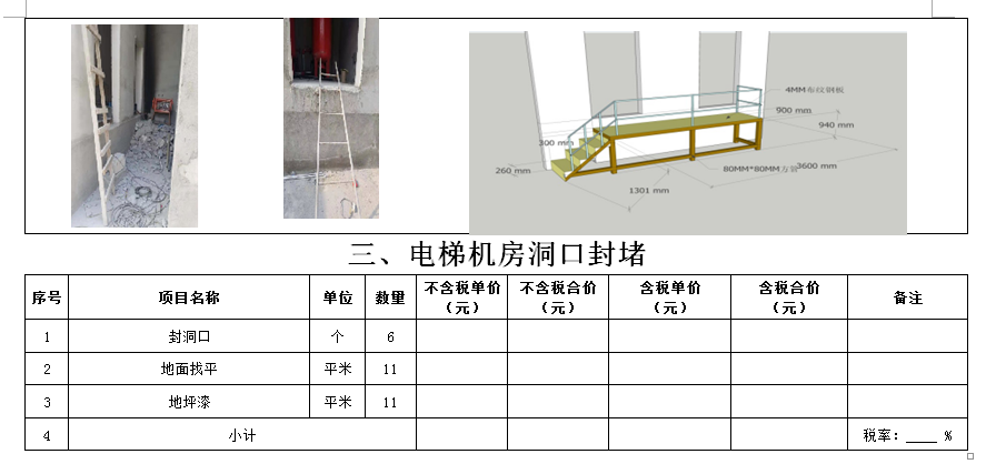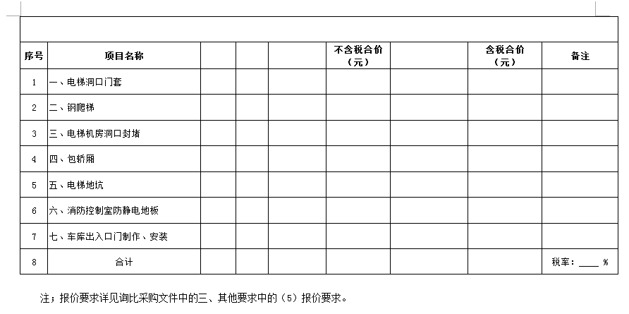 (5)采購范圍:電梯洞口門套、鋼爬梯、電梯機(jī)房洞口封堵、包轎廂、地面找平、地下車庫出入口真石漆等(詳見清單)等相關(guān)工作,具體內(nèi)容詳見采購文件。